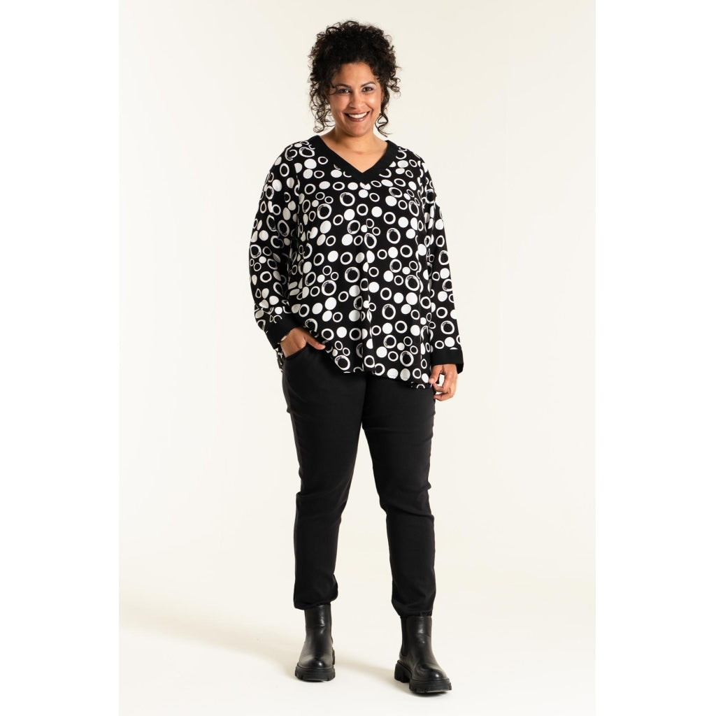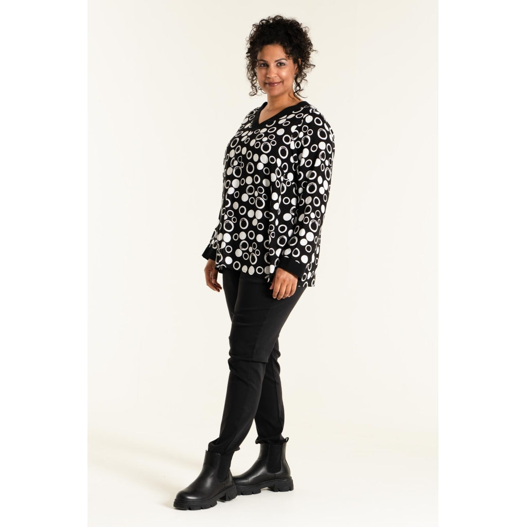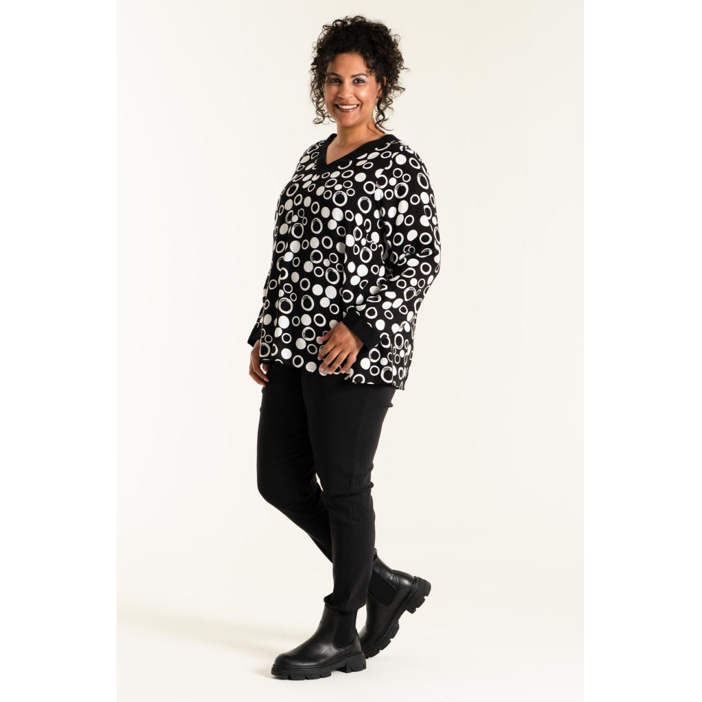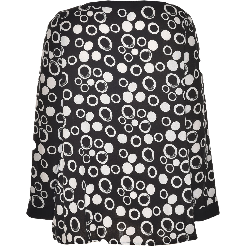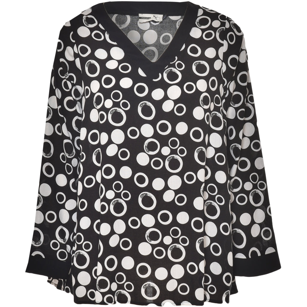 Smuk bluse med grafisk print i sort og hvid. Viskose af høj kvalitet og generøs V-hals. Lange ærmer.