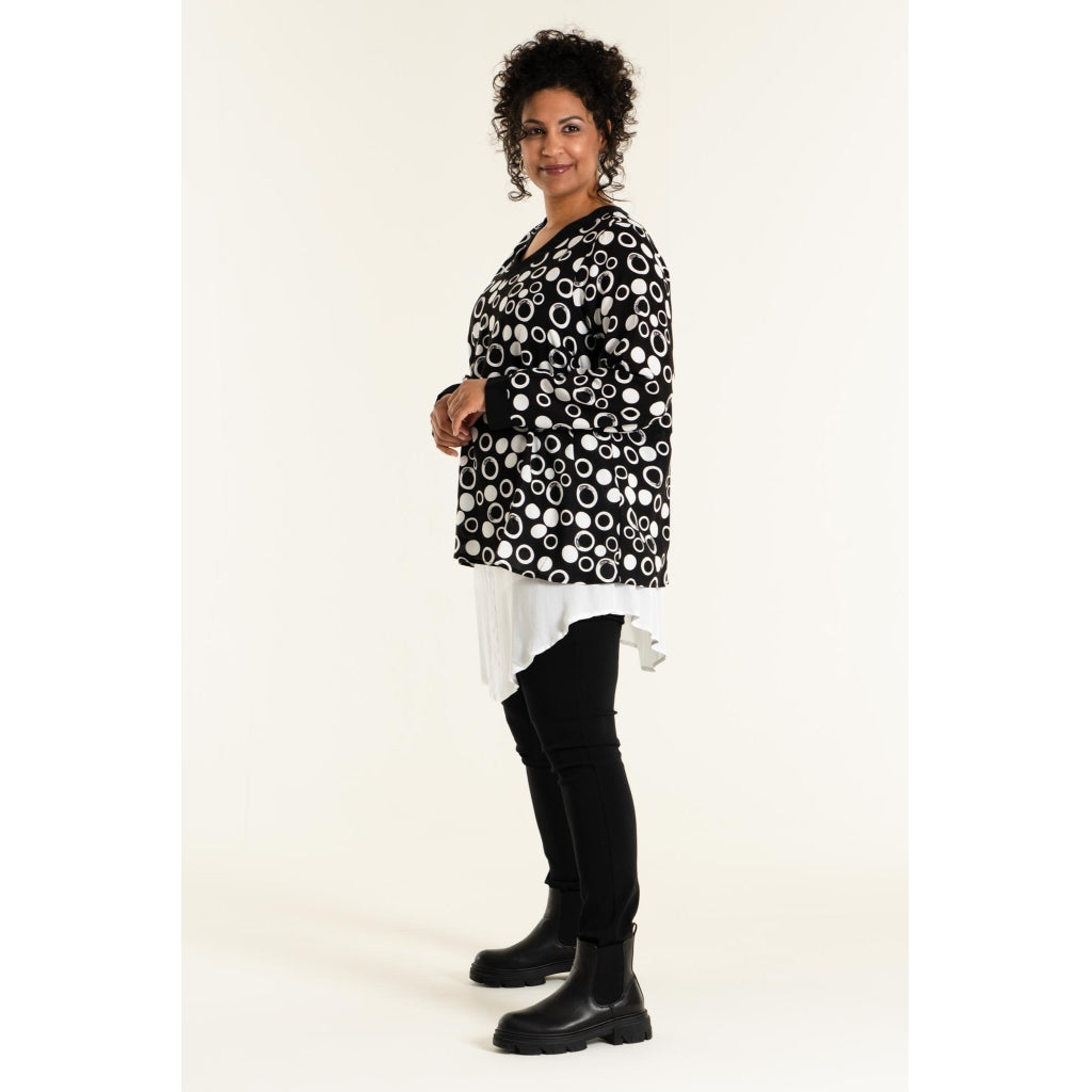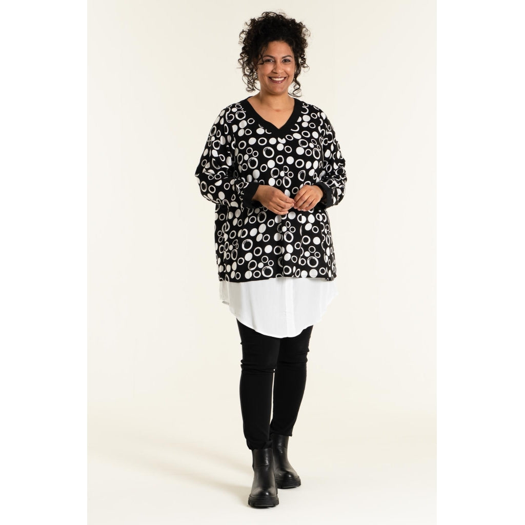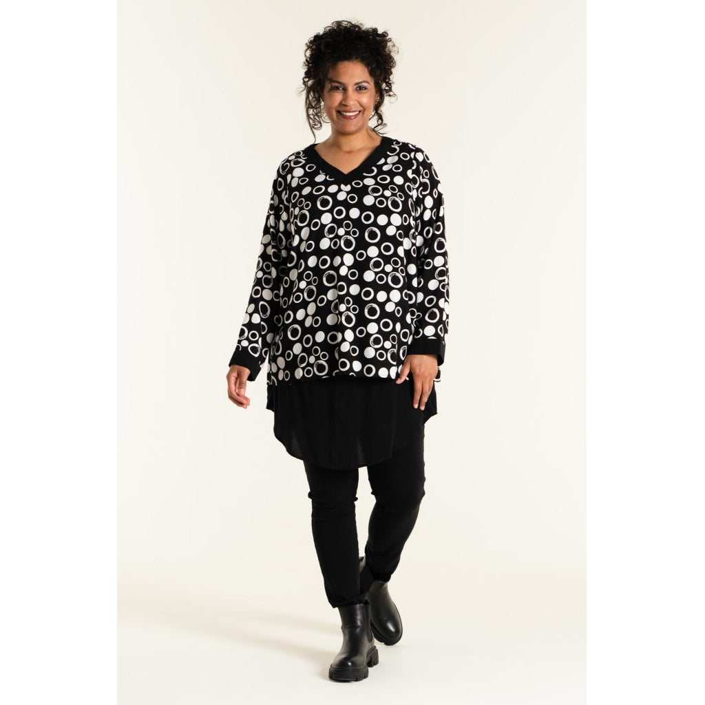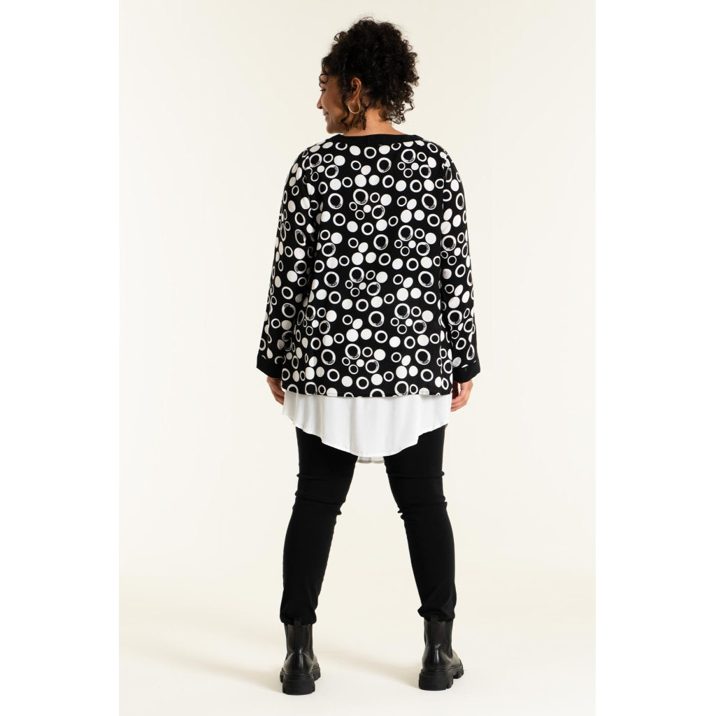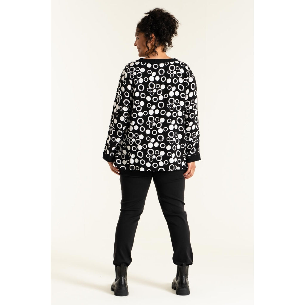 Smuk bluse med grafisk print i sort og hvid. Viskose af høj kvalitet og generøs V-hals. Lange ærmer.