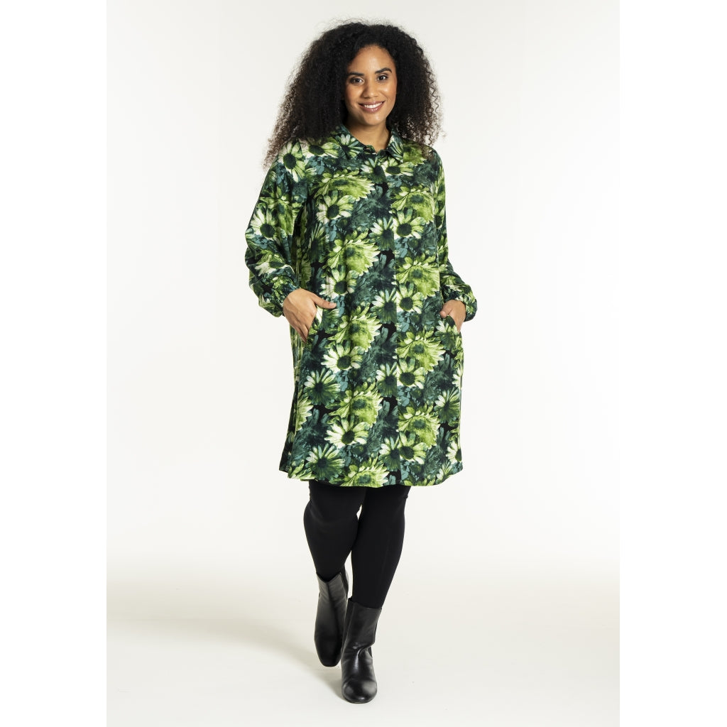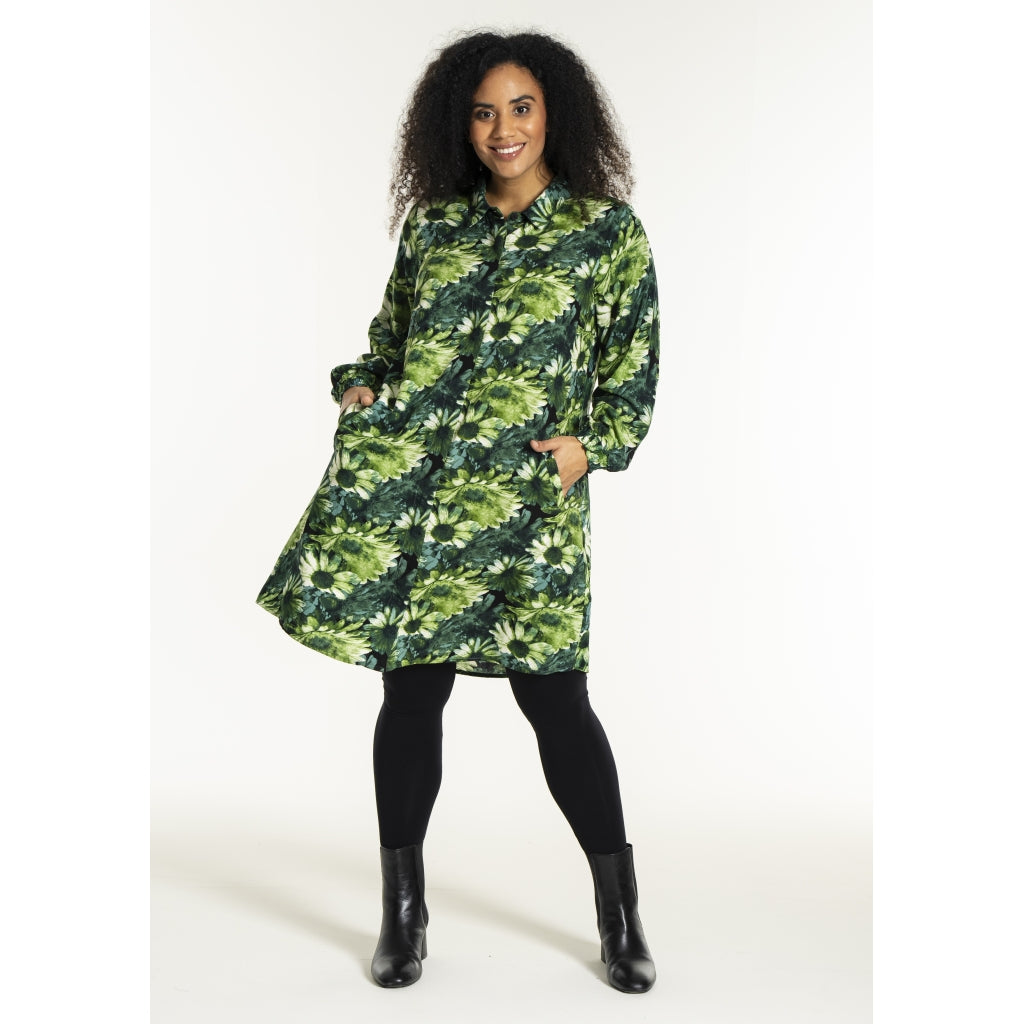 Lang skjorte med blomsterprint i grønne toner med naturinspireret udtryk. Skjorten er 100% viskose med klassisk skjortekrave og skjult knaplukning hele vejen ned foran. Ærmerne er lange og afsluttes med en smockmanchet.