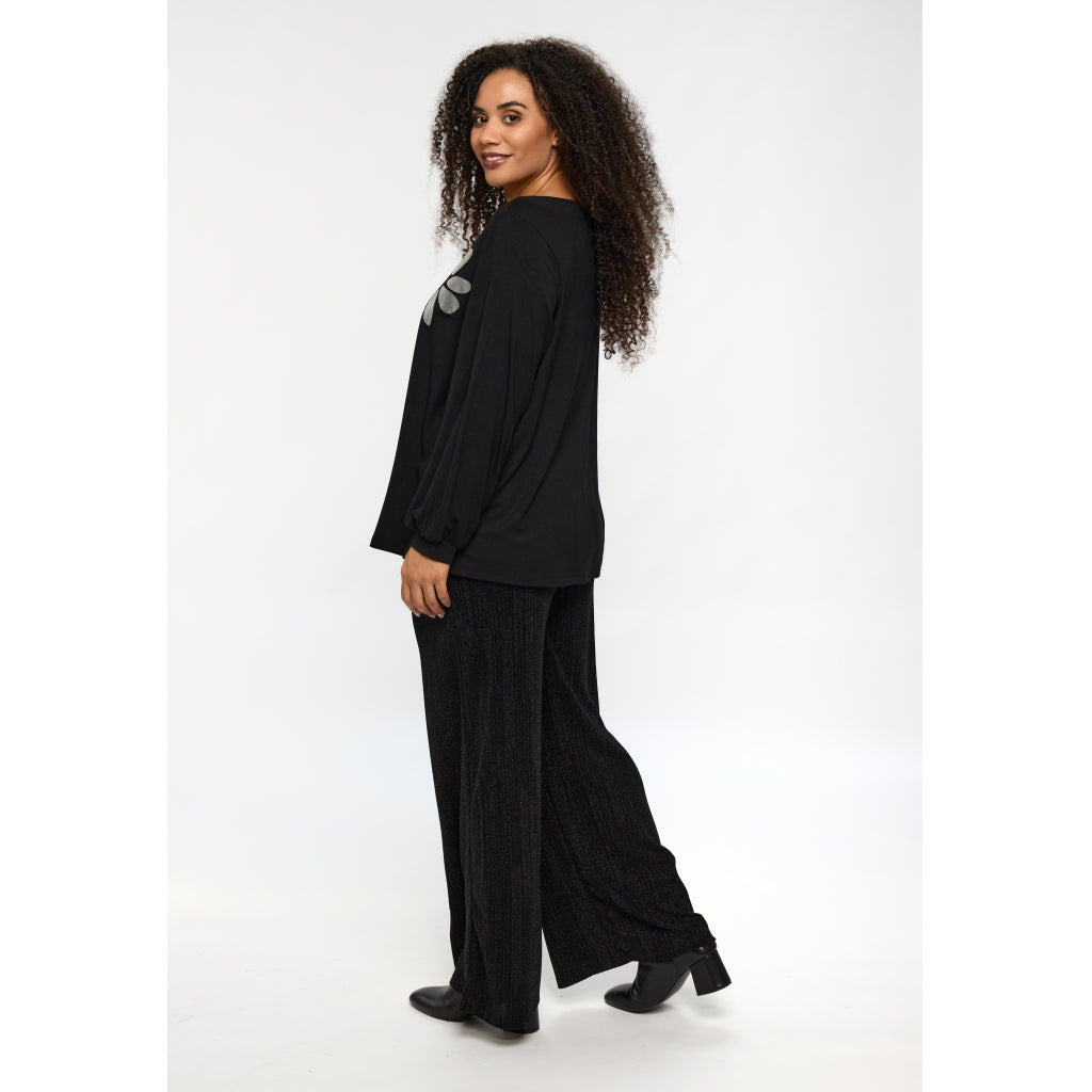 En elegant bluse i 92% viskose og 8% elastan, der kombinerer et klassisk sort grunddesign med fine guld- eller sølv detaljer i blomstermønsteret. Designet har lange ærmer og en løs pasform, hvilket giver et sofistikeret udseende - ideelt til både hverdagsbrug og særlige lejligheder.