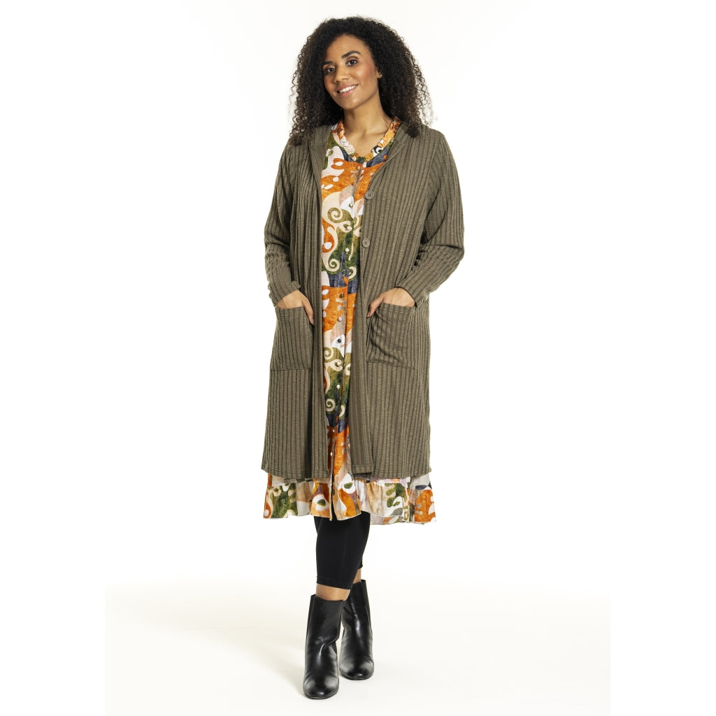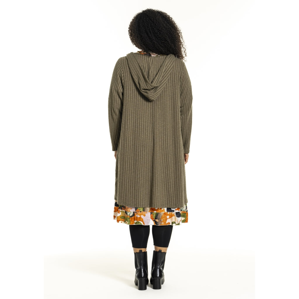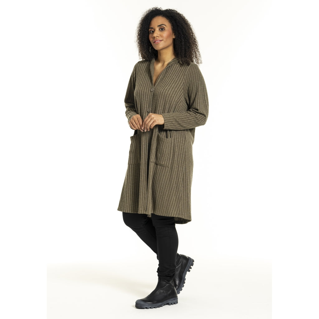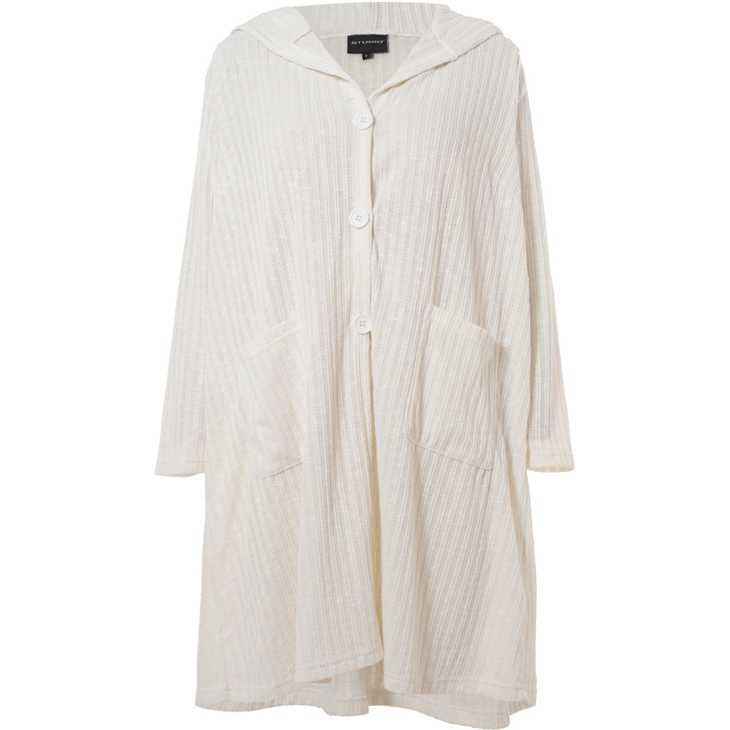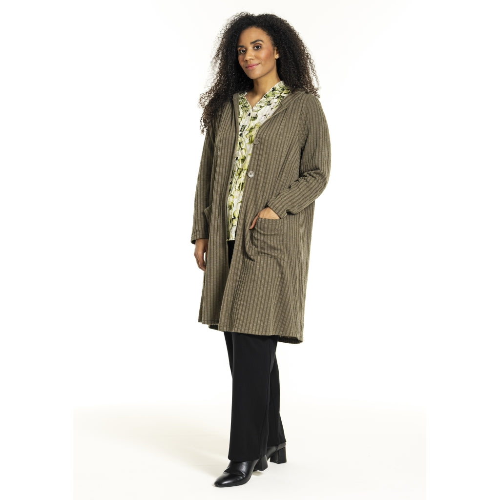 Fed, ensfarvet cardigan i elastisk polyester. Cardiganen er løstsiddende med knaplukning. Stylen er med hætte og påsatte lommer.
