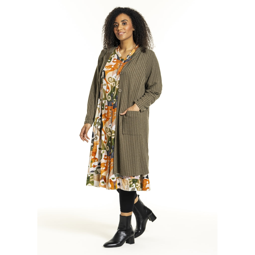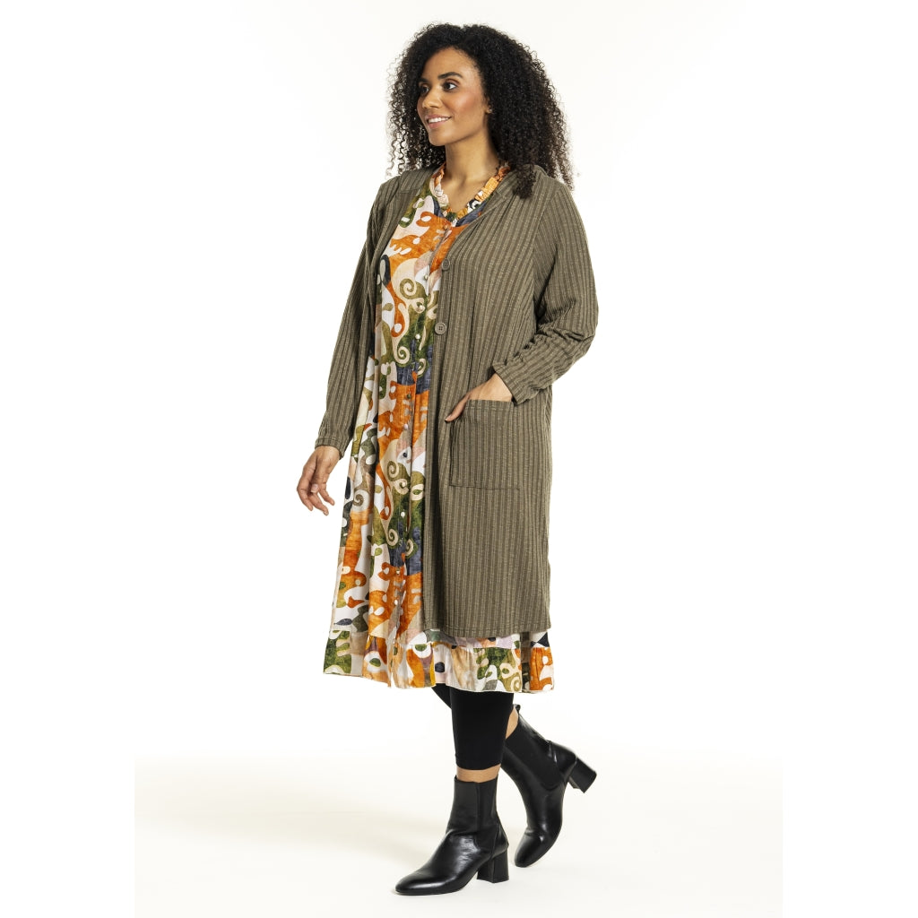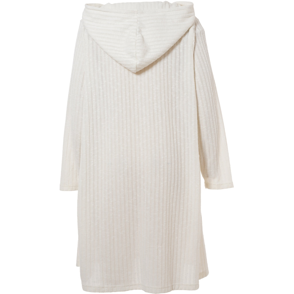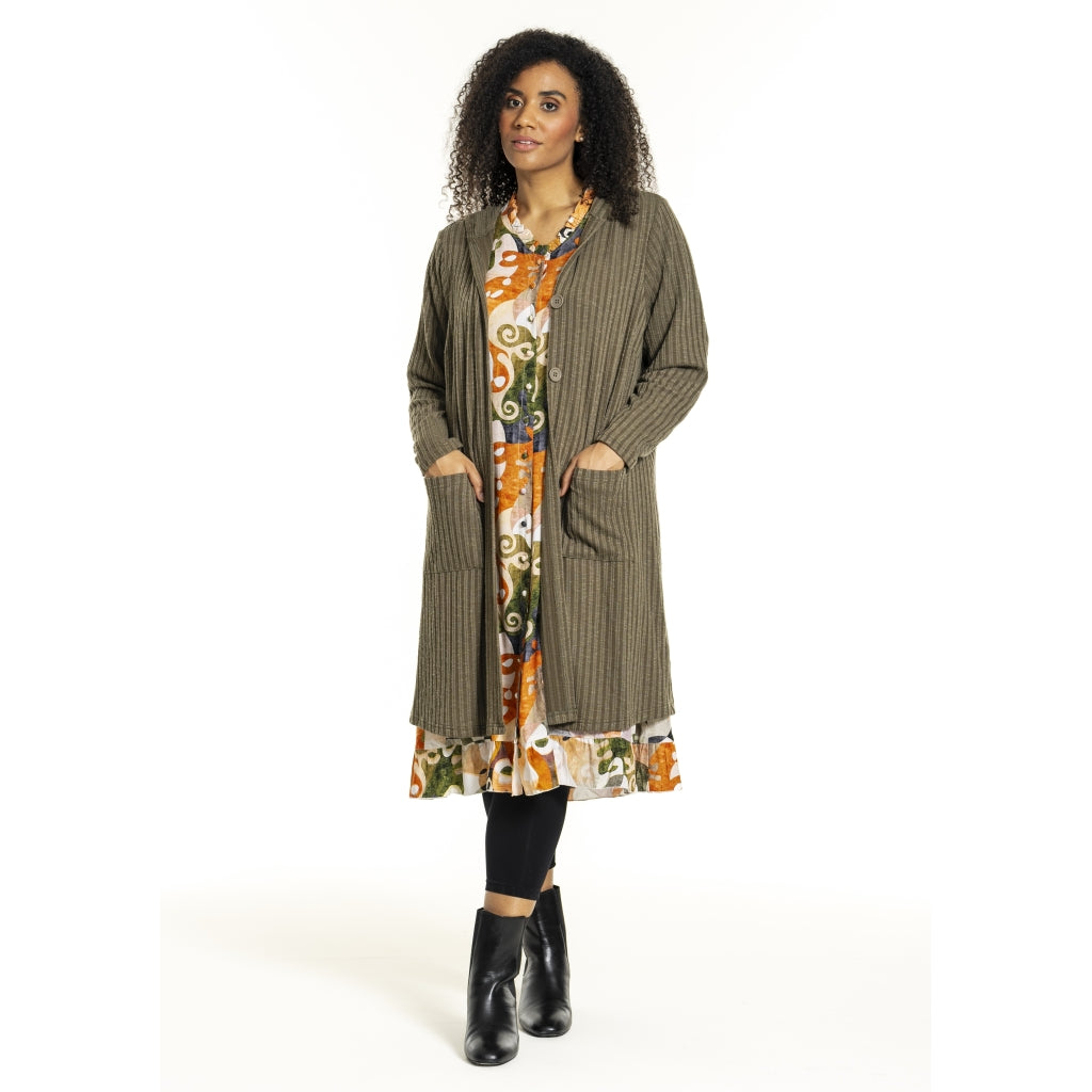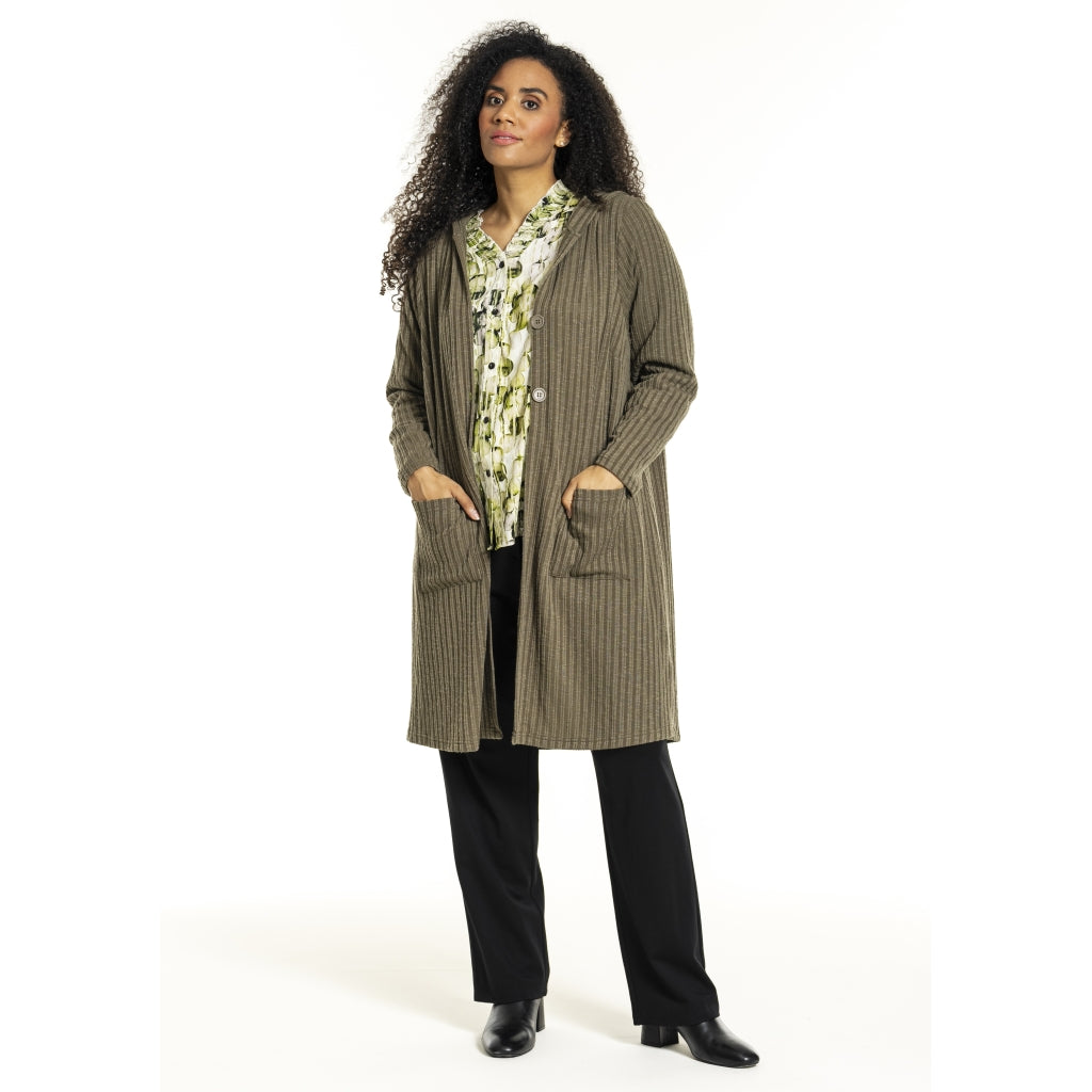 Fed, ensfarvet cardigan i elastisk polyester. Cardiganen er løstsiddende med knaplukning. Stylen er med hætte og påsatte lommer.