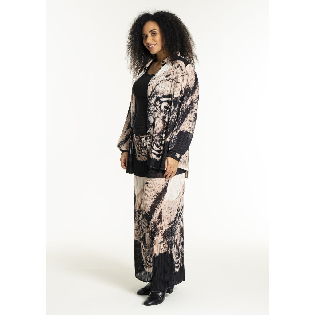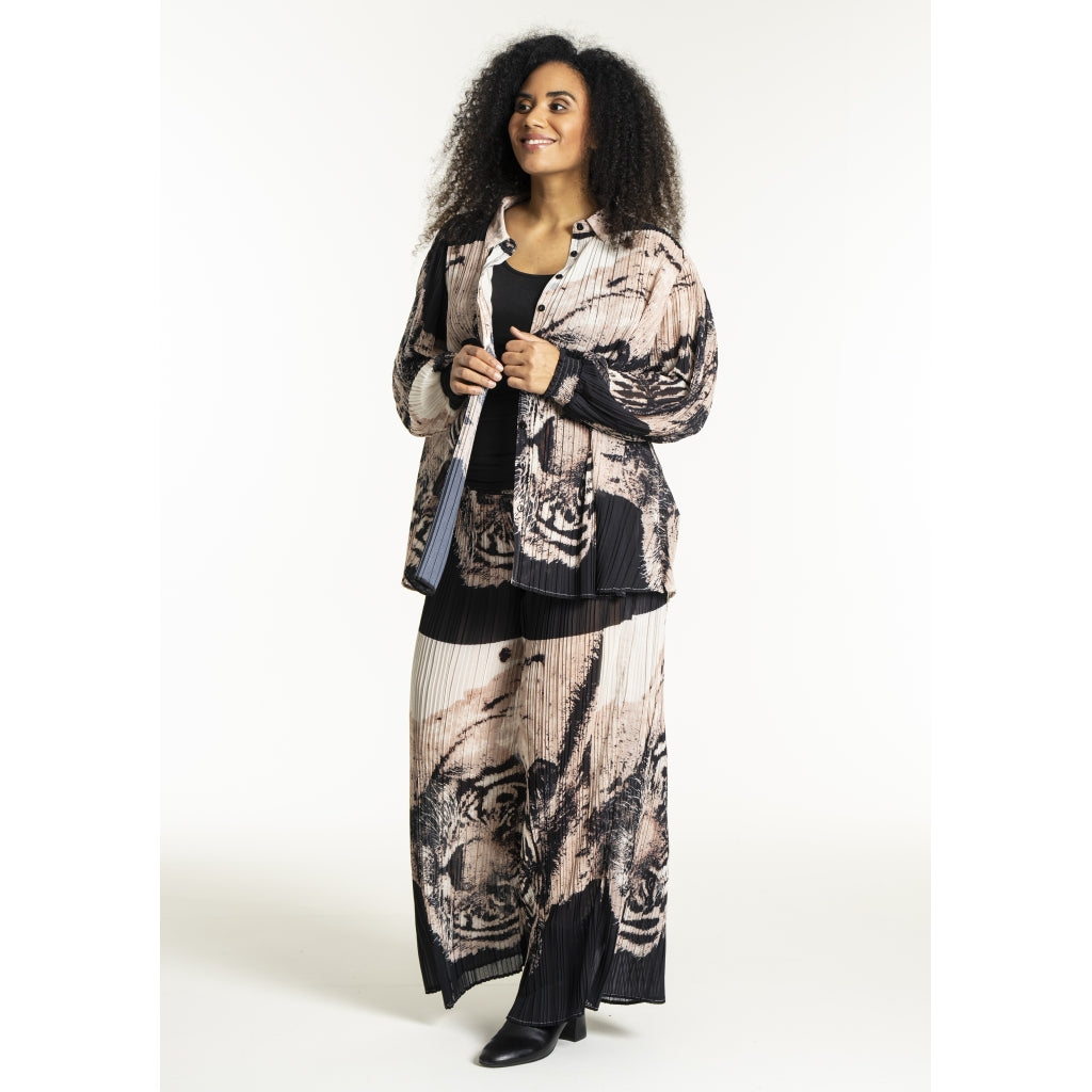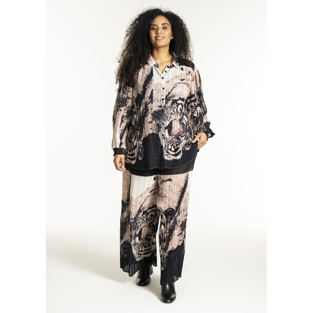 Flot, plisseret skjorte med flot print i sort, beige og offwhite nuancer med tigeransigter i kunstnerisk collageeffekt. Skjorten har en løs og afslappet pasform, som understreges af det lette, plisserede materiale. Den har klassisk skjortekrave, gennemgående knaplukning og lange ærmer med smockdetaljer ved manchetterne, som skaber en blød rynkeeffekt.