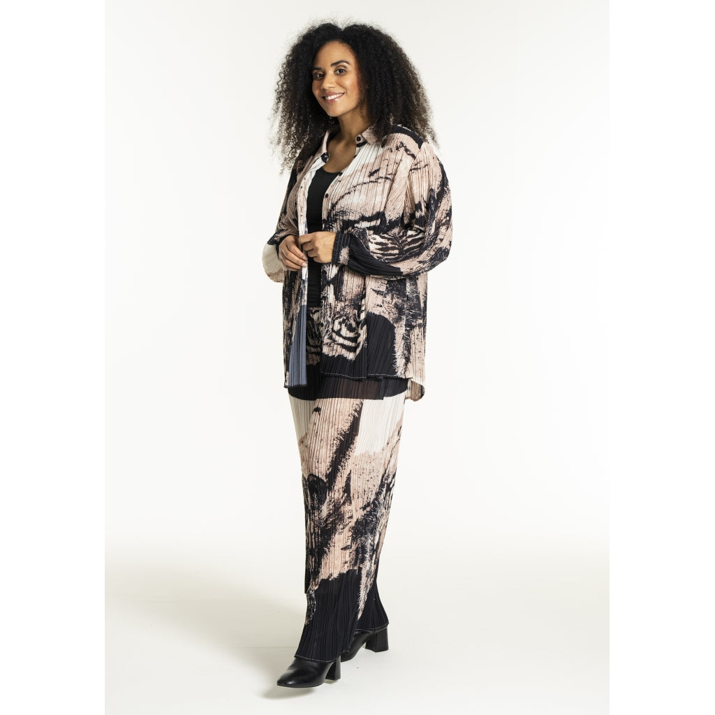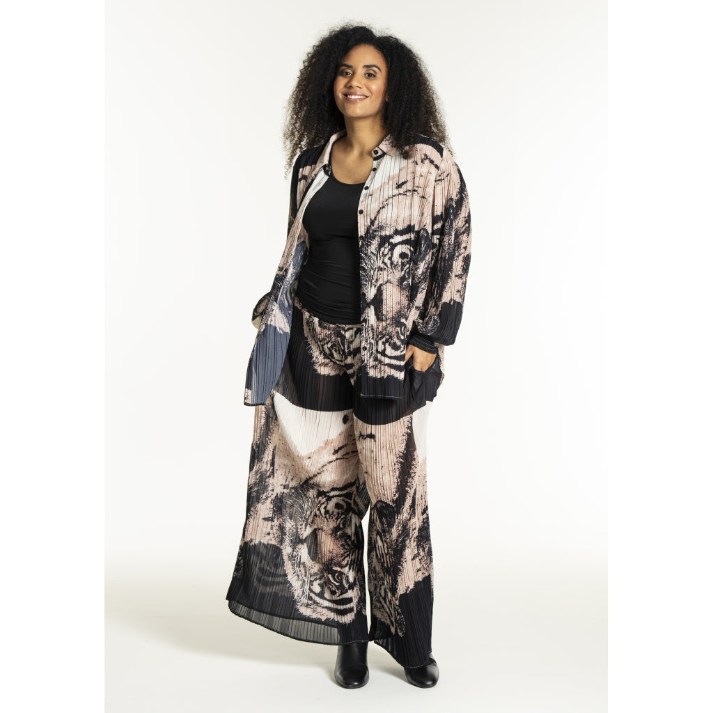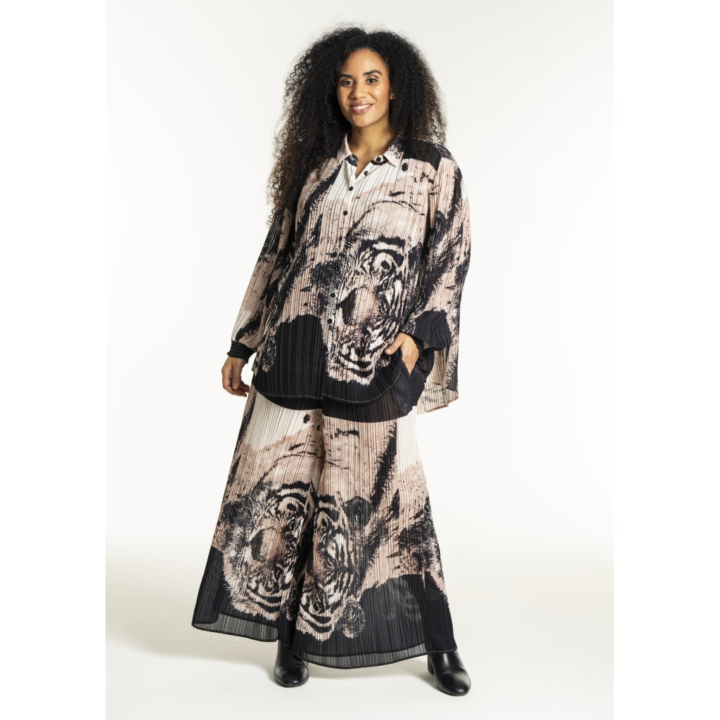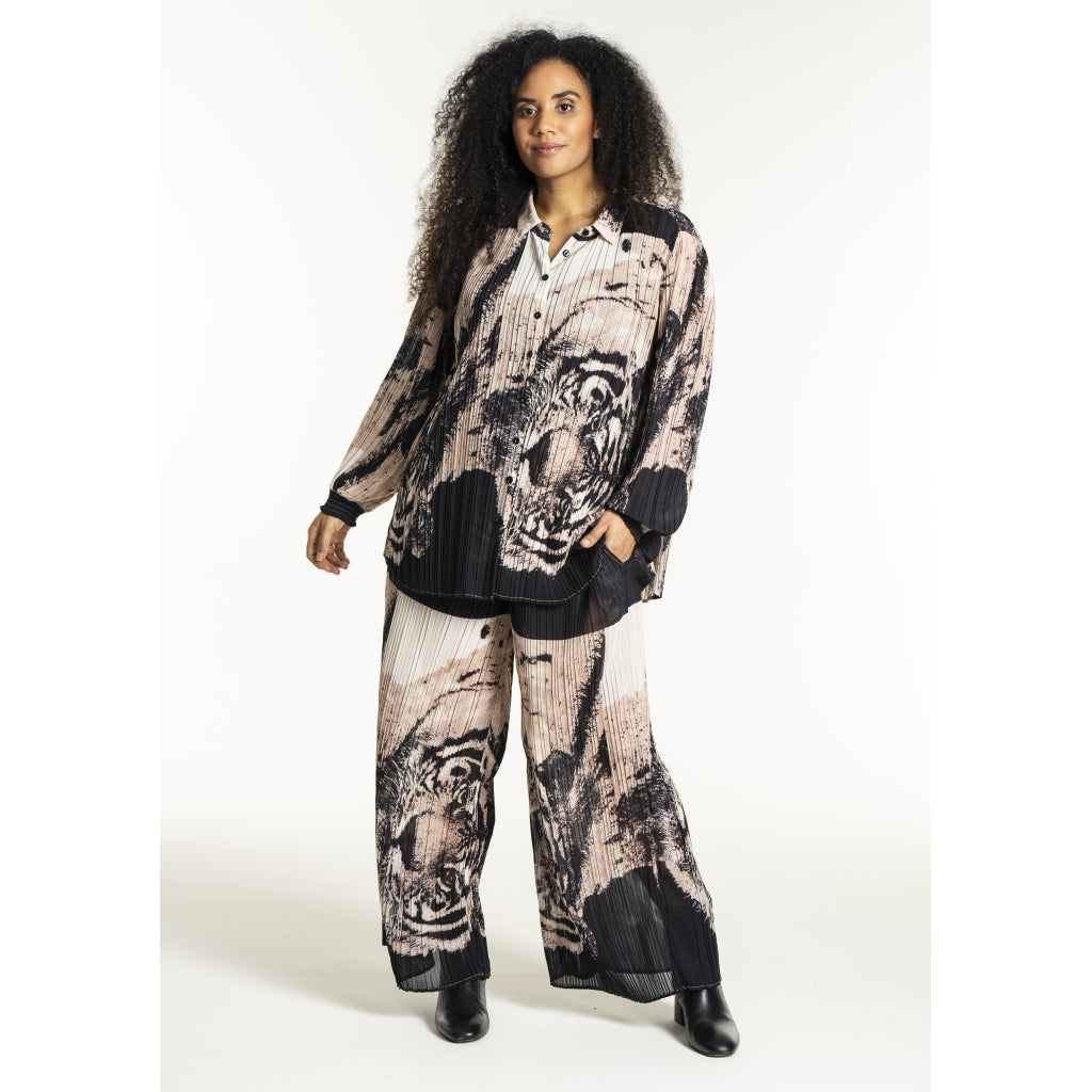 Flot, plisseret skjorte med flot print i sort, beige og offwhite nuancer med tigeransigter i kunstnerisk collageeffekt. Skjorten har en løs og afslappet pasform, som understreges af det lette, plisserede materiale. Den har klassisk skjortekrave, gennemgående knaplukning og lange ærmer med smockdetaljer ved manchetterne, som skaber en blød rynkeeffekt.
