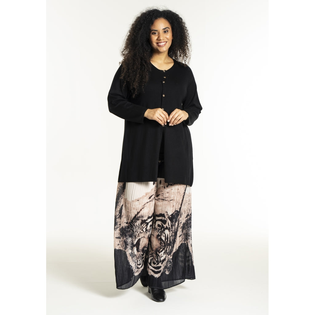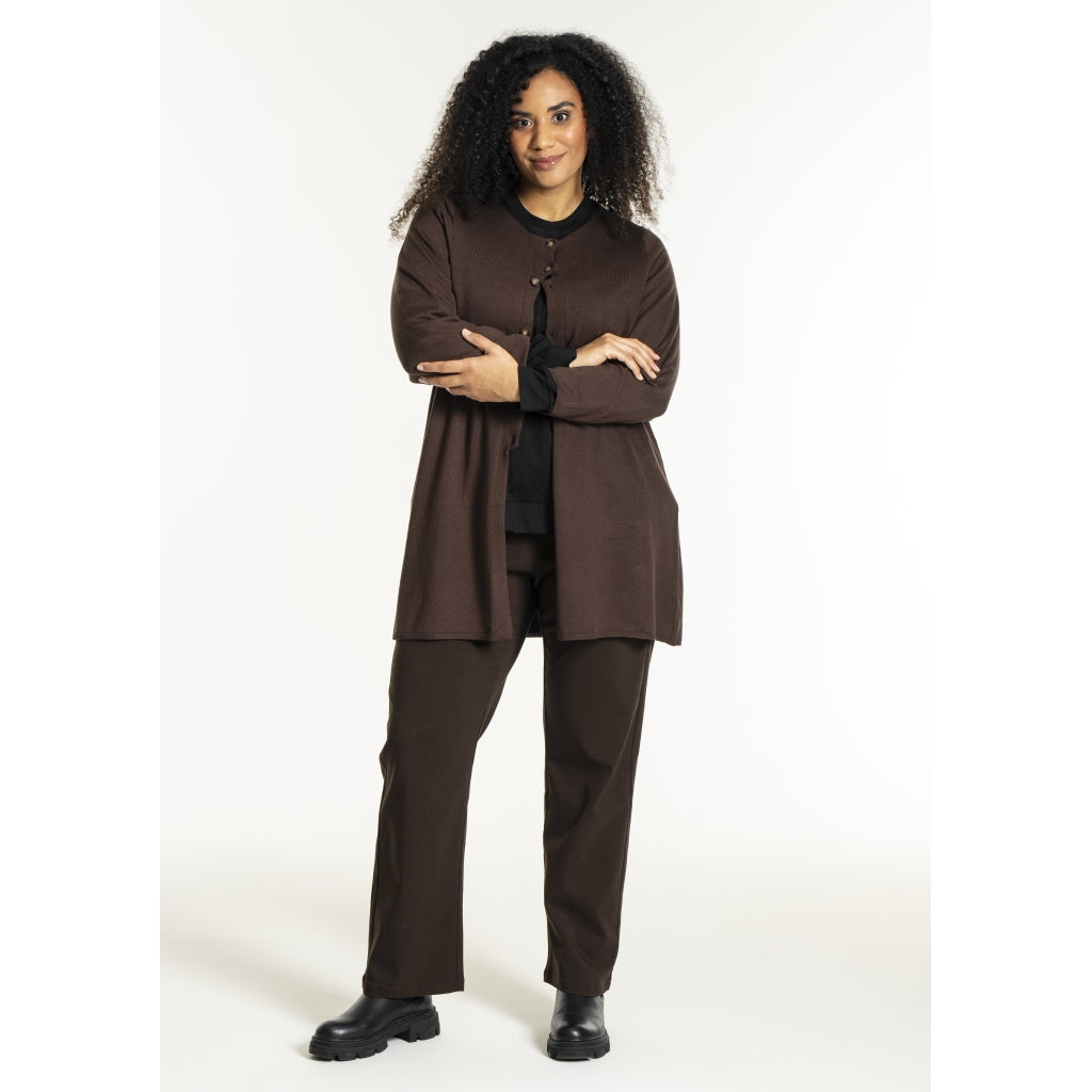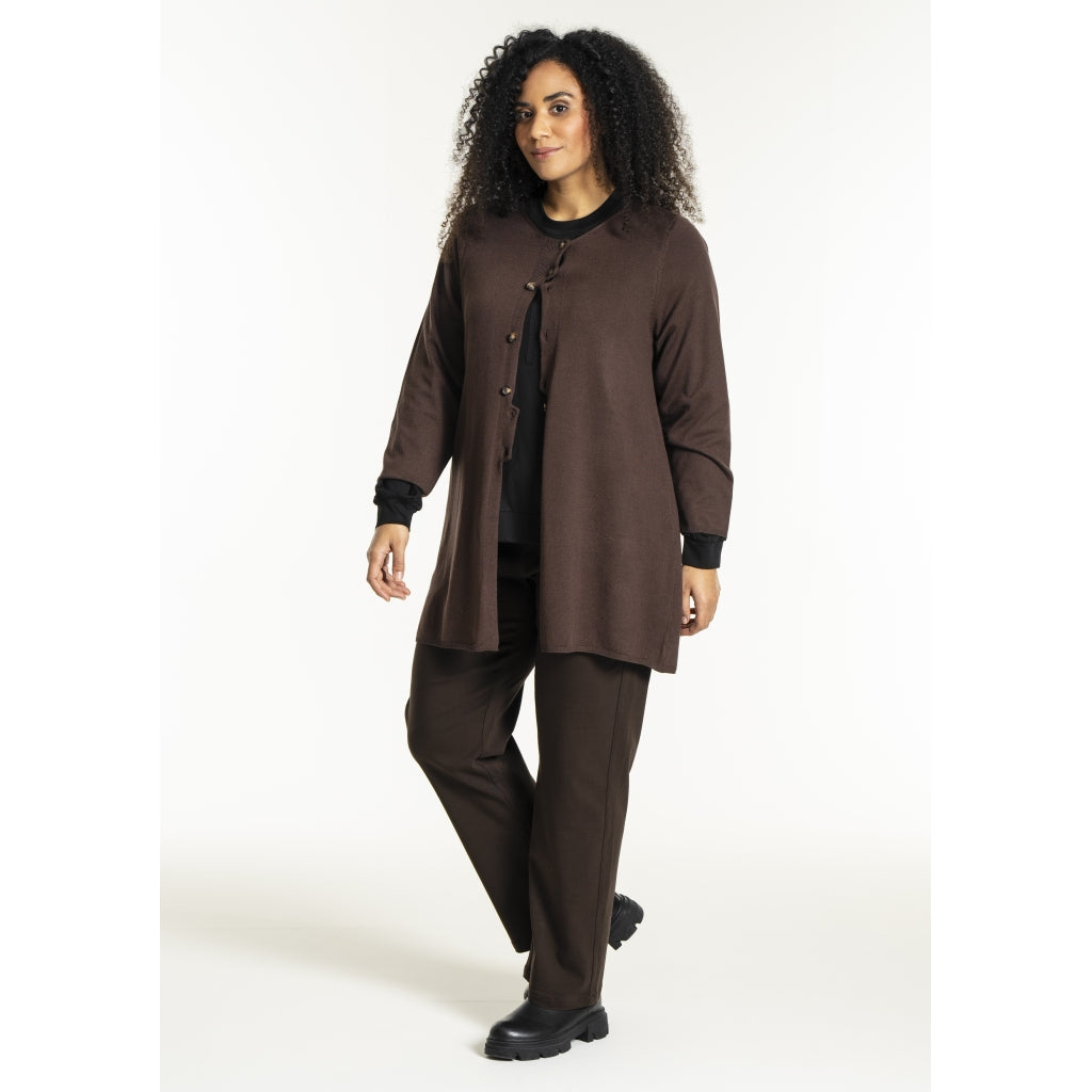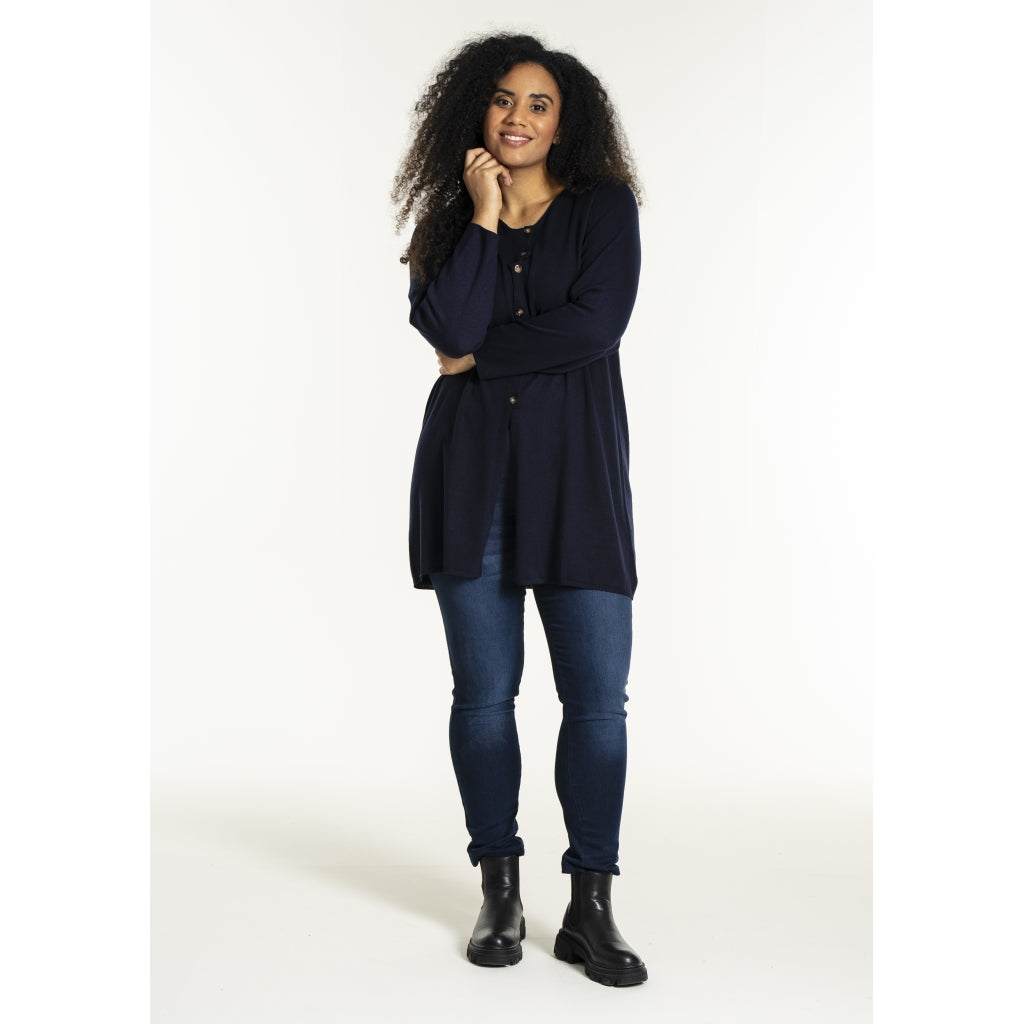 Feminin, ensfarvet strikket cardigan med lækre detaljer. Stylen er en smule A-formet i elastisk mix af viskose og nylon. Derudover har cardiganen dekorativ gennemgående grupperet knaplukning.