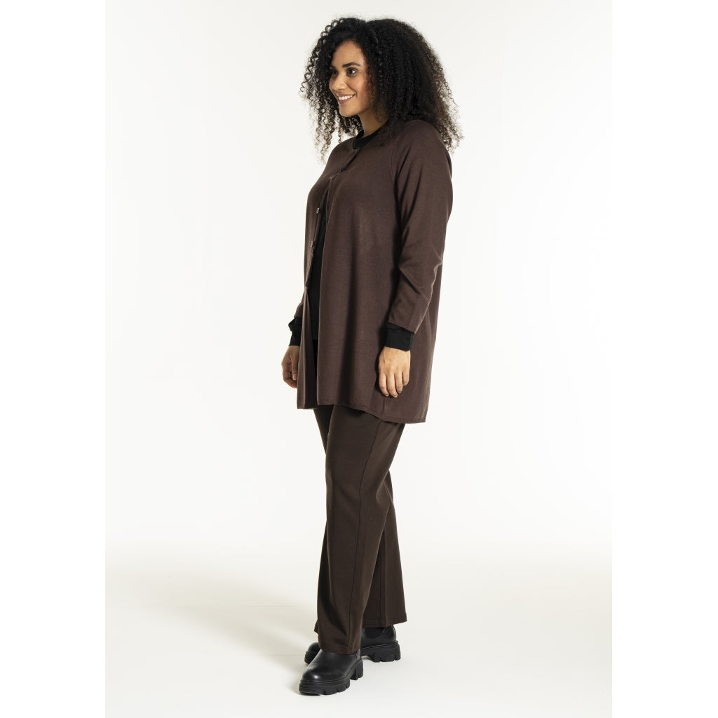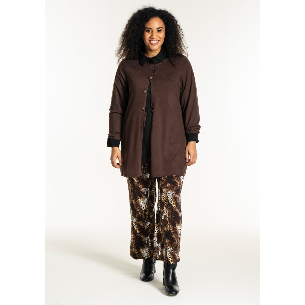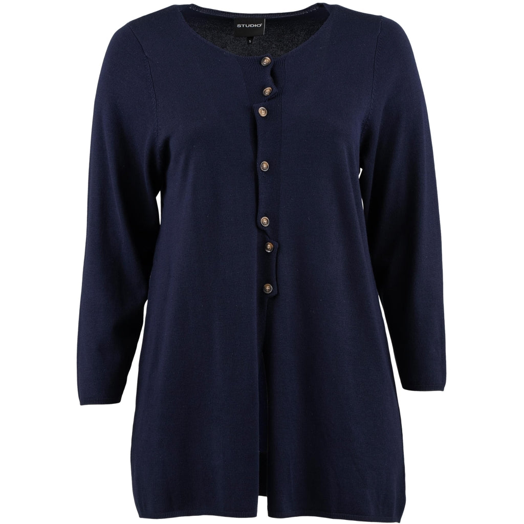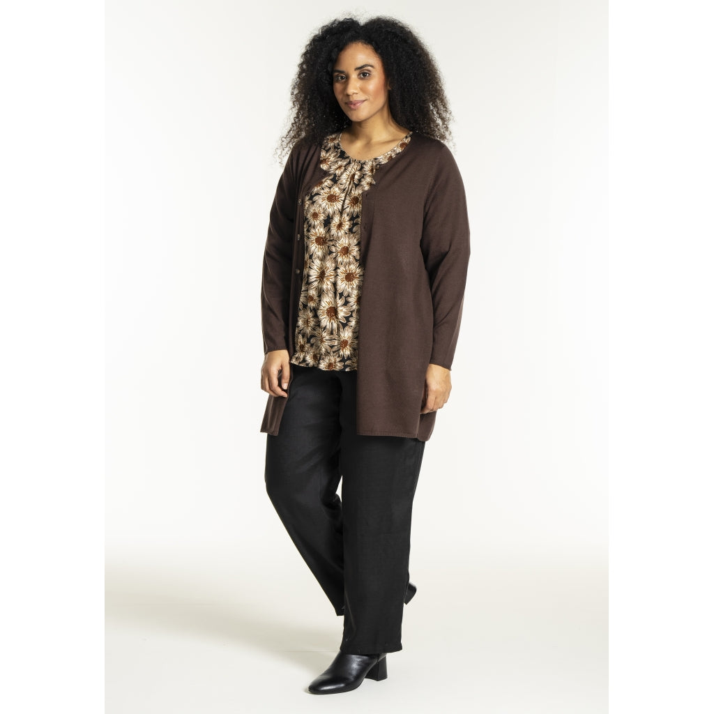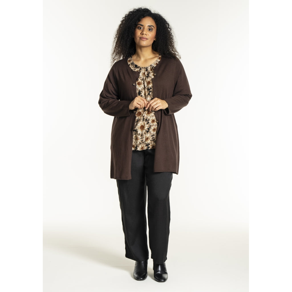 Feminin, ensfarvet strikket cardigan med lækre detaljer. Stylen er en smule A-formet i elastisk mix af viskose og nylon. Derudover har cardiganen dekorativ gennemgående grupperet knaplukning.
