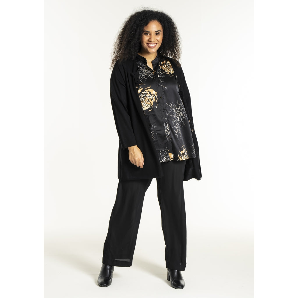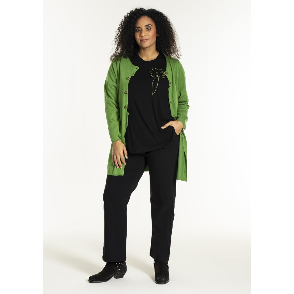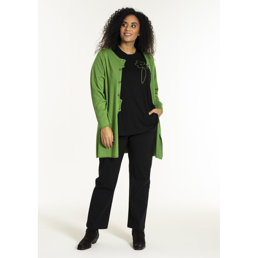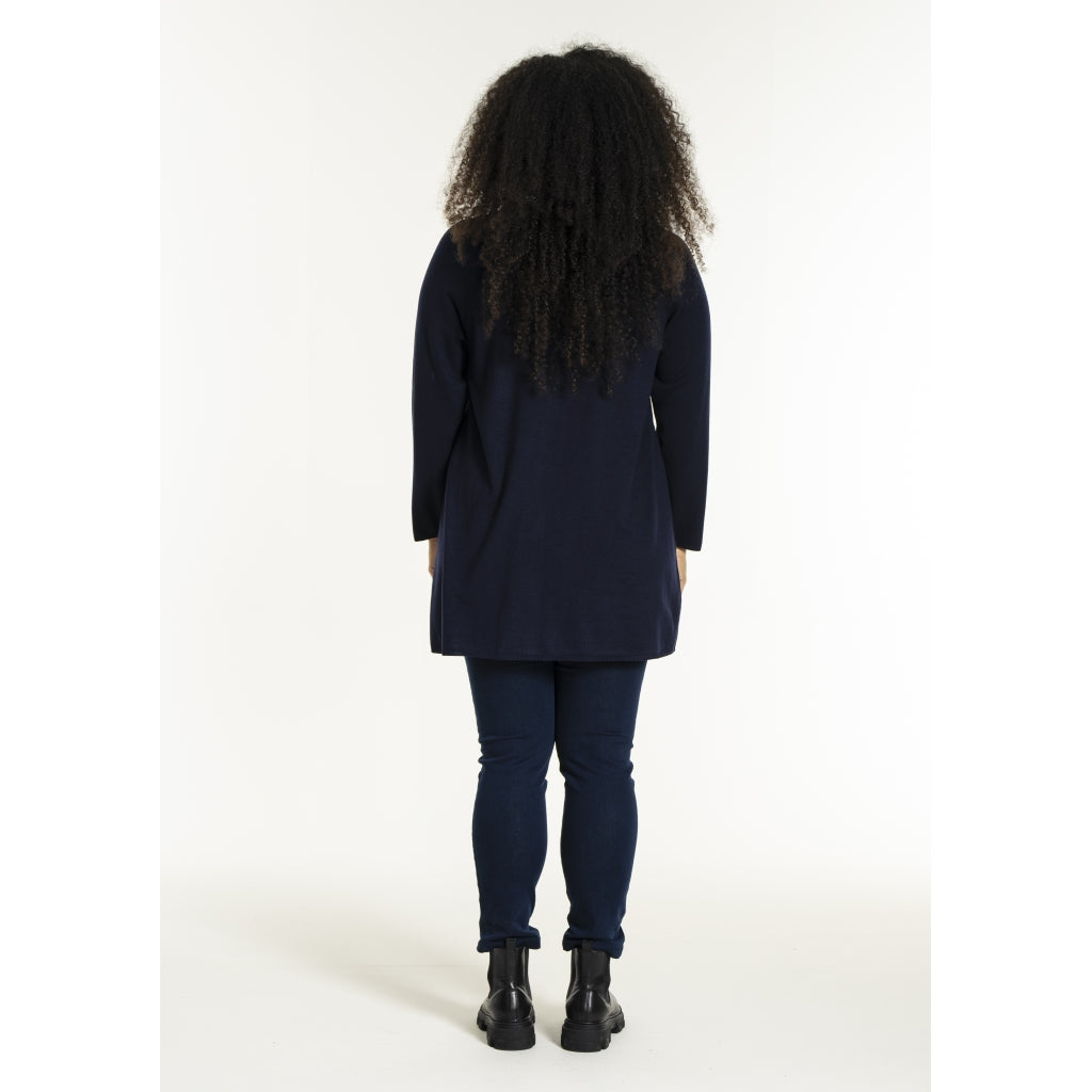 Feminin, ensfarvet strikket cardigan med lækre detaljer. Stylen er en smule A-formet i elastisk mix af viskose og nylon. Derudover har cardiganen dekorativ gennemgående grupperet knaplukning.